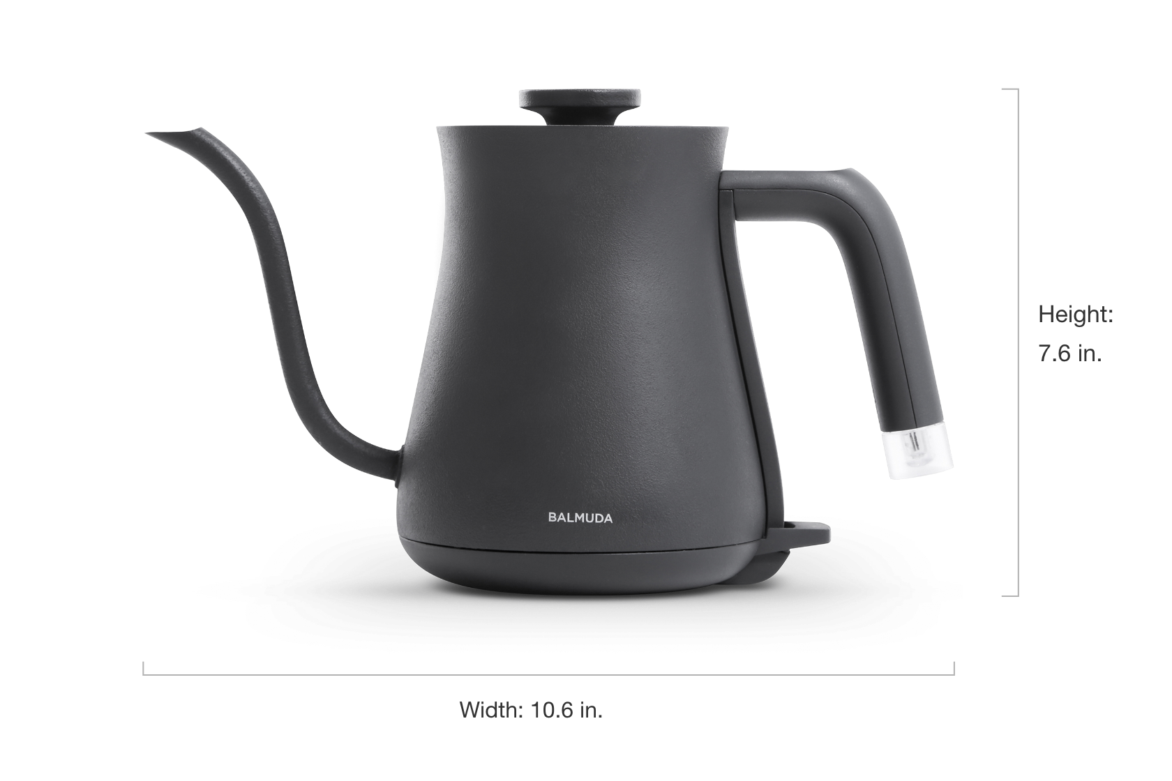 BALMUDA The Kettle is a minimalist design piece with a precision pouring spout — compact 0.6 L capacity and 1200 W rated power consumption.