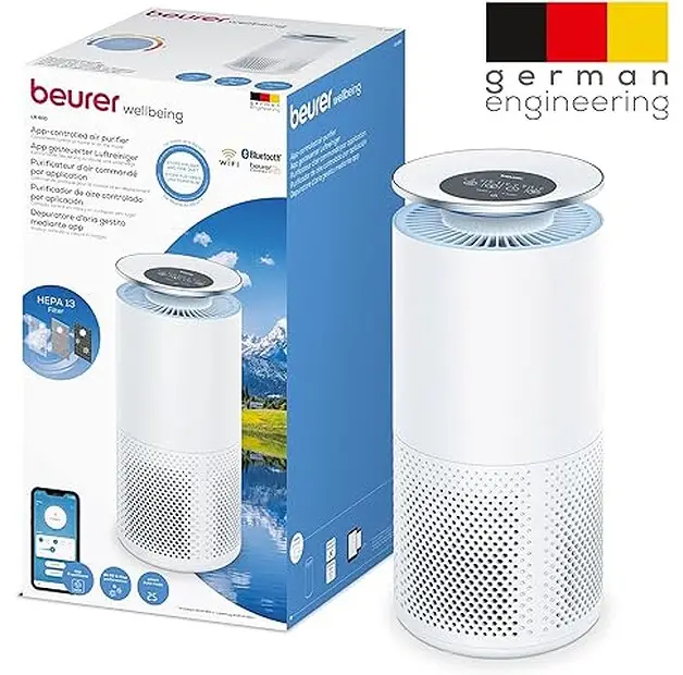 The Beurer FreshAir 400 (LR 400) is a smart, app-controlled air purifier with a sleek modern design. It features a three-stage filtration system — pre-filter, HEPA H13 filter, and activated carbon filter — that removes up to 99.95% of particles ≥ 0.3 µm and 95% of particles down to 0.02 µm. Controlled via Bluetooth/Wi‑Fi and the FreshHome app, it offers real-time air quality stats, scheduling, timer, turbo, night mode, UV-light option, and a filter change indicator
