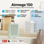 The Coway Airmega 150 is a compact, powerful, and energy-efficient air purifier certified by ECARF and QuietMark. It features a 3-stage HyperCaptive™ filtration system including a pre-filter, deodorization filter, and GreenHEPA filter. This advanced setup captures 99.999% of particles as small as 0.01 µm, including pollen, dust, smoke, and allergens, while also reducing 99% of VOCs and odors. With a CADR of 281 m³/h, it purifies rooms up to 73 m² effectively, and smaller spaces in minutes. The unit includes auto mode, real-time air quality monitoring, a filter replacement indicator, and touch-button control. Running at just 20 dB in standby, it offers clean air all year with filters lasting up to 12 months.