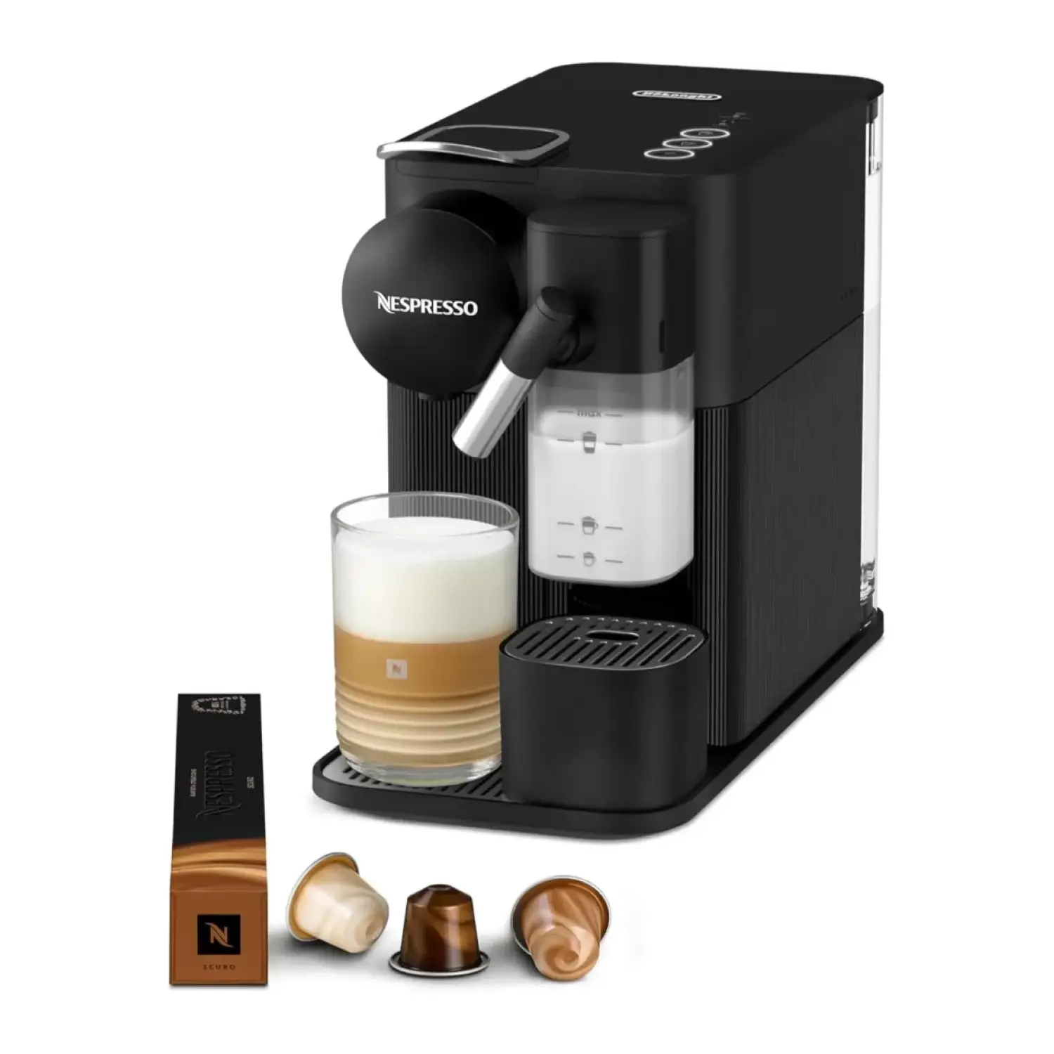 The De’Longhi Nespresso Lattissima One Evo EN510.B offers an elegant and compact solution for effortless coffee preparation. This capsule-based espresso machine features a 19-bar pressure pump and One-Touch Fresh Milk System to deliver rich espressos and smooth milk-based beverages. The intuitive interface provides direct access to three milk recipes—espresso macchiato, cappuccino, and latte macchiato. The 165 ml single-serving milk jug and removable water tank are easy to clean and dishwasher-safe. With its sleek matte black finish and energy efficiency class A+, it blends style with functionality for everyday use.
