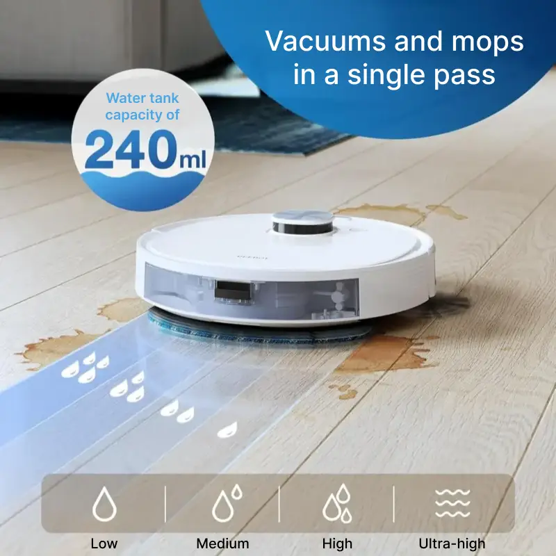 In addition to vacuuming, the N10 PLUS is equipped with OZMO™ mopping technology, enabling it to mop your floors with electronically controlled water flow. The integrated water tank ensures consistent dampness across surfaces without over-saturating, and the mop plate applies gentle pressure to lift light stains — leaving your floors shiny and sanitized.