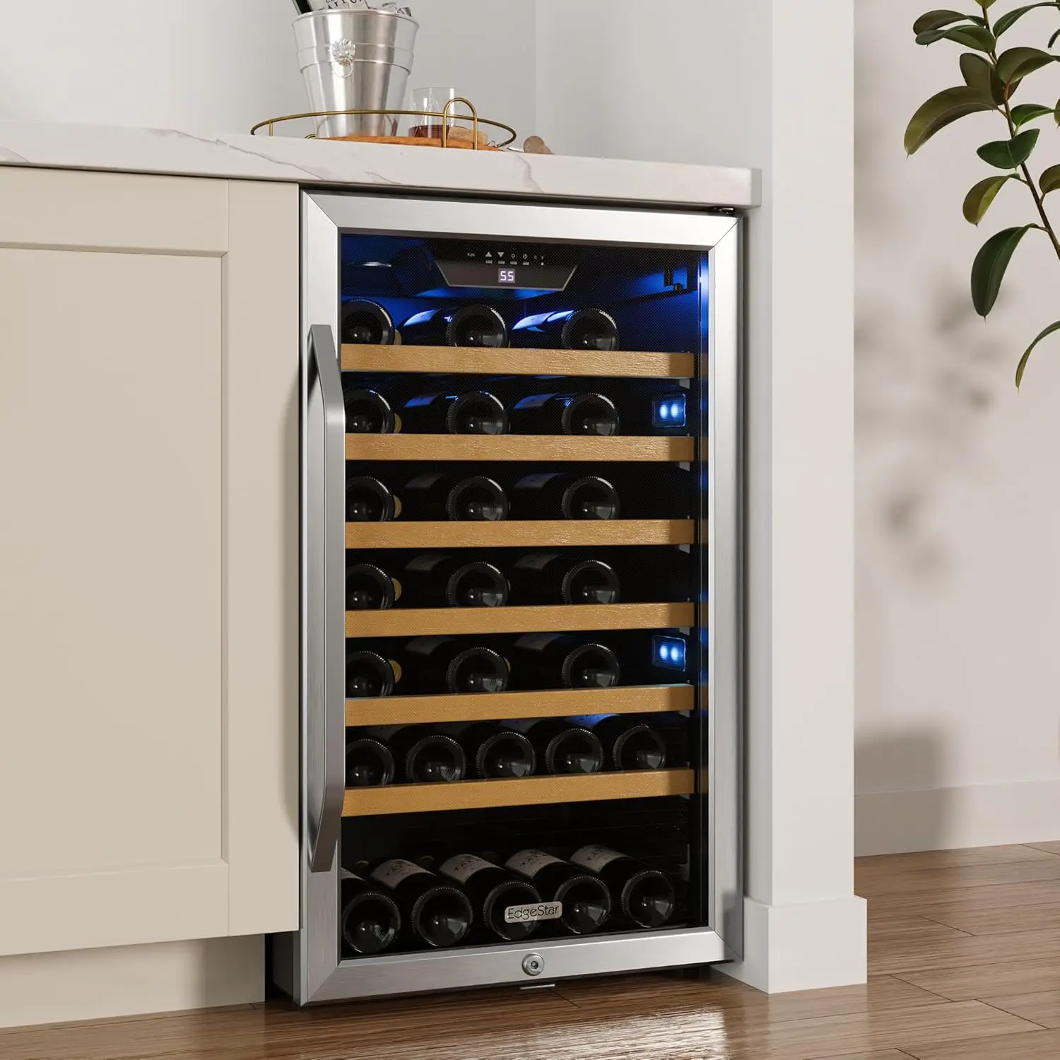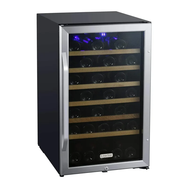 Spacious enough for a serious collection yet compact enough to fit into a variety of spaces, the EdgeStar CWF440SZ is a no-nonsense freestanding wine cooler that delivers reliable single-zone compressor cooling for up to 44 standard Bordeaux bottles. With its stainless steel exterior, reversible lockable door, and atmospheric blue LED lighting, it’s equally at home in a kitchen, dining room, or home bar.