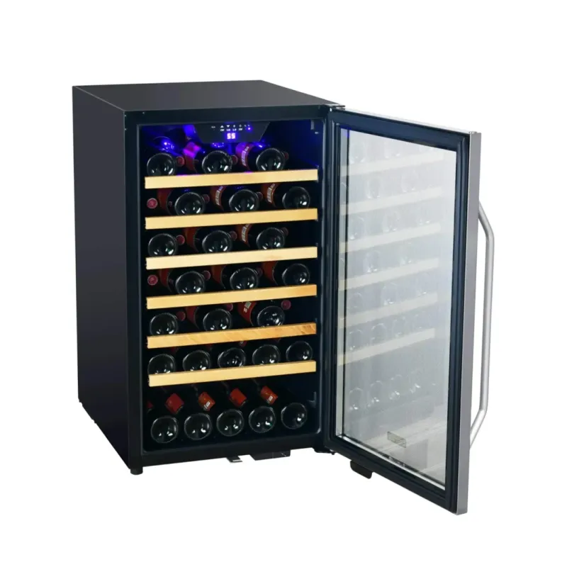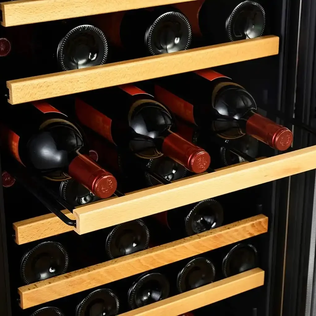 - 44-bottle capacity across 6 removable metal shelves with handsome wood faces