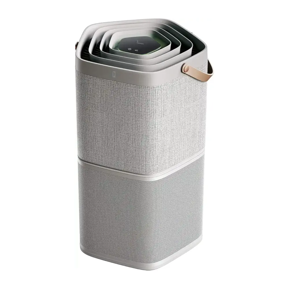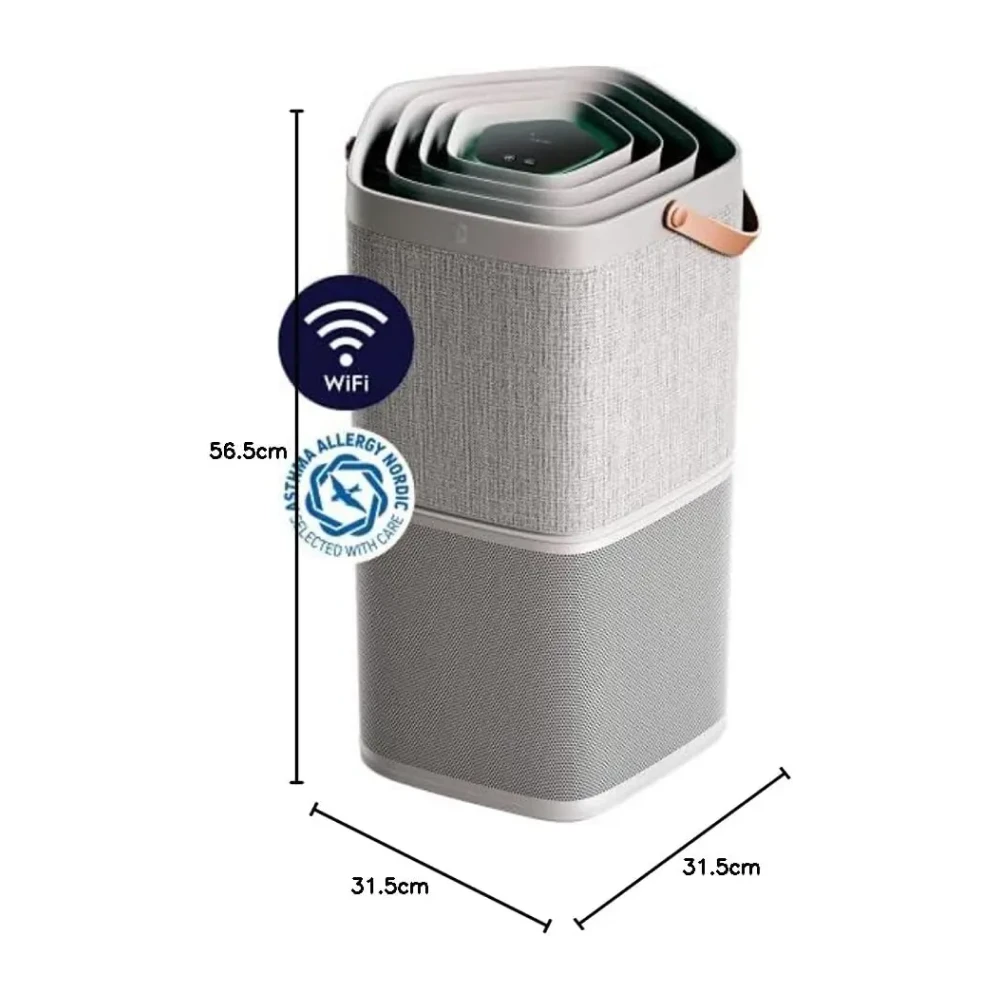 The Electrolux Pure A9 PA91-404GY is a high-performance, connected air purifier designed for large rooms up to 92 m². It features a 5-stage filtration system: mesh pre-filter, antibacterial layer, fine particle filter, activated carbon filter, and an ionizer — capable of filtering 99.5% of particles down to 0.1 µm and reducing 97% of VOCs and odors. The 360° AirSurround system ensures even air circulation, while the PureSense sensor continuously monitors and adjusts purification based on indoor air quality. The device is controlled via a touch panel or the Wellbeing mobile app (iOS/Android), which also tracks real-time air quality and filter status (via RFID chip). Certified by ECARF and Asthma Allergy Nordic, it is exceptionally quiet (17 dB in silent mode) and energy-efficient. The elegant Scandinavian design complements any modern interior.
