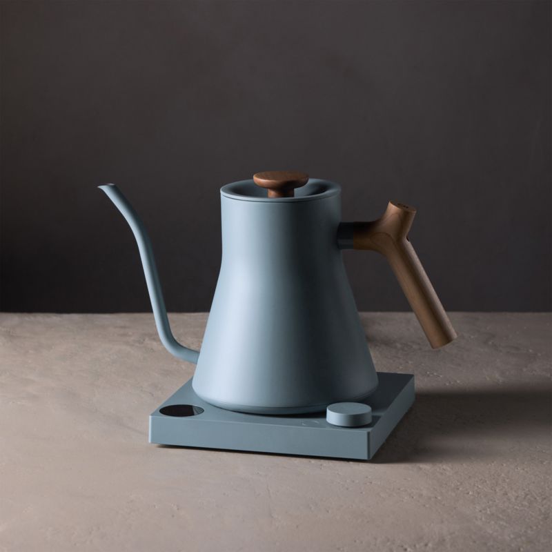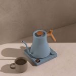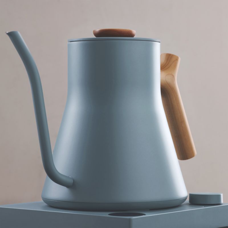 Hazy Blue is the gentlest of the exclusive EKG Pro colourways. The colour of a sky on a warm afternoon — not the saturated blue of clear weather, but the softer, paler blue of haze and distance. It is a colour that belongs to a kitchen that values calm, that resists the urge to make a dramatic statement and instead creates an atmosphere. Paired with the maple handle and knob — whose warm, honey-toned wood grain adds just enough texture and warmth to prevent the blue from feeling cold — the result is the most serene kettle Fellow has ever produced.