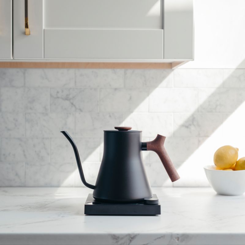 This is the kettle for kitchens that build their aesthetic around contrast — dark surfaces with warm wood, concrete with oak, slate with walnut. It coordinates with MUJI shelving, with IKEA’s warm wood systems, with reclaimed wood chopping boards, with leather-handled utensils. It is the kind of object that interior designers buy for clients and stylists reach for when they want a kettle that photographs perfectly.
