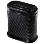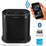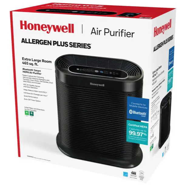 The Honeywell HPA8350B is a smart home air purifier equipped with True HEPA filtration and Bluetooth Smart v4.0 connectivity. It captures up to 99.97% of airborne particles as small as 0.3 microns, including dust, pollen, pet dander, and smoke. A VOC sensor enables automatic adjustments to indoor air quality, while the app (iOS and Android) allows remote control, allergen alerts, proximity activation, custom schedules, and filter reminders. The unit features 4 fan speeds, touch controls, dimmable panel lighting, a timer (1–18h), and silent operation. With CADR ratings of 300+ (smoke/pollen/dust), it circulates air up to 4.8x per hour in rooms up to 43 m² (465 sq. ft.). Includes Honeywell-certified A+ carbon pre-filter and 3 R-type HEPA filters.