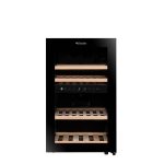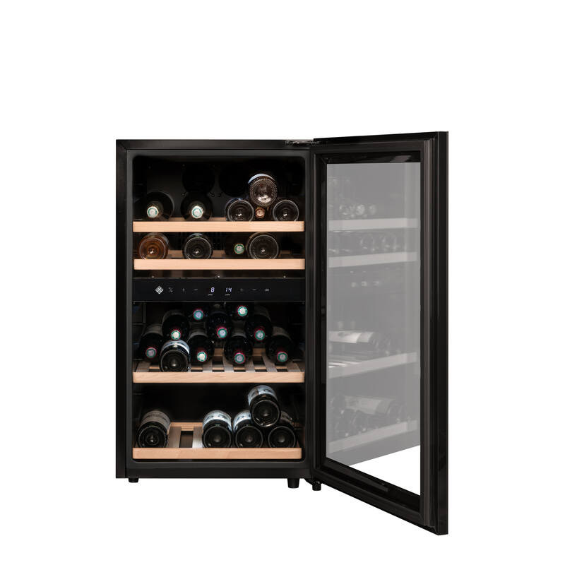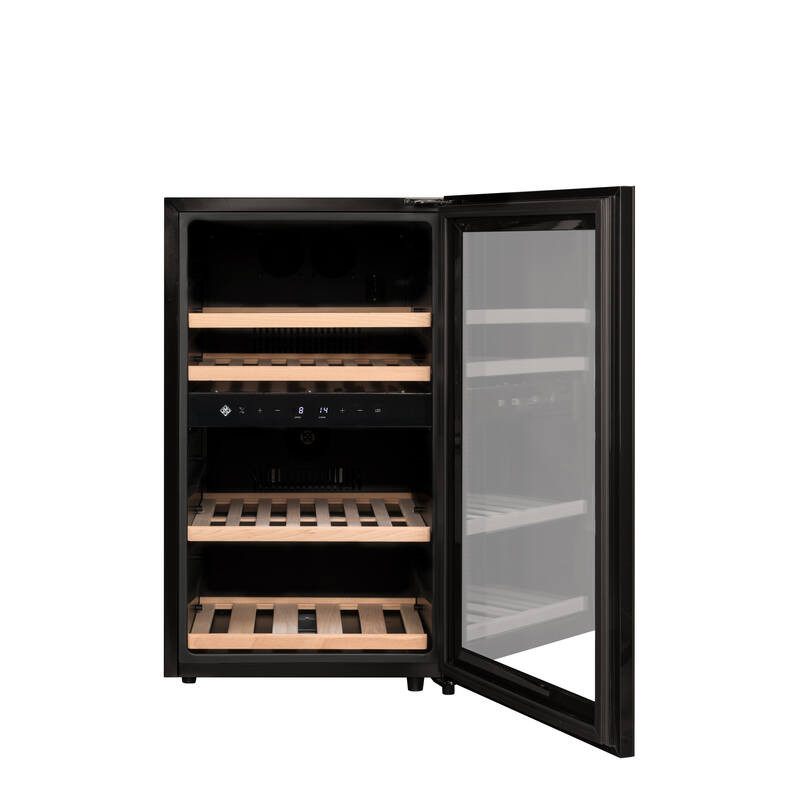 The upper zone holds 21 bottles at 5–10°C (ideal for white, rosé and sparkling wines), while the lower zone holds 24 bottles at 10–20°C for reds and longer-term storage. Four beech wood semi-sliding shelves provide elegant, bottle-friendly storage in a striking All Black finish with UV-treated tempered glass door and warm LED interior lighting.