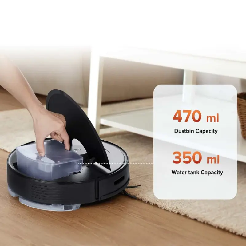 - 350 ml water tank and 470 ml dustbin, integrated for compact performance